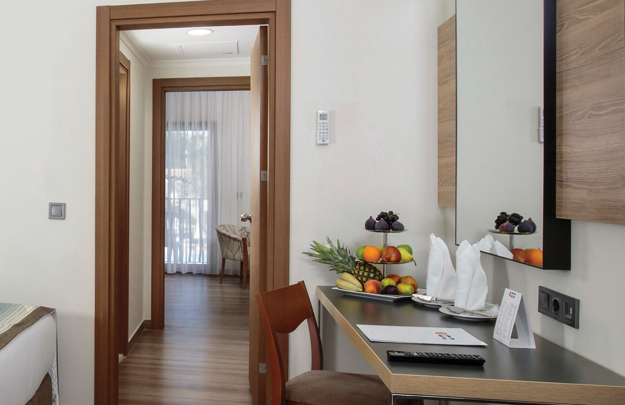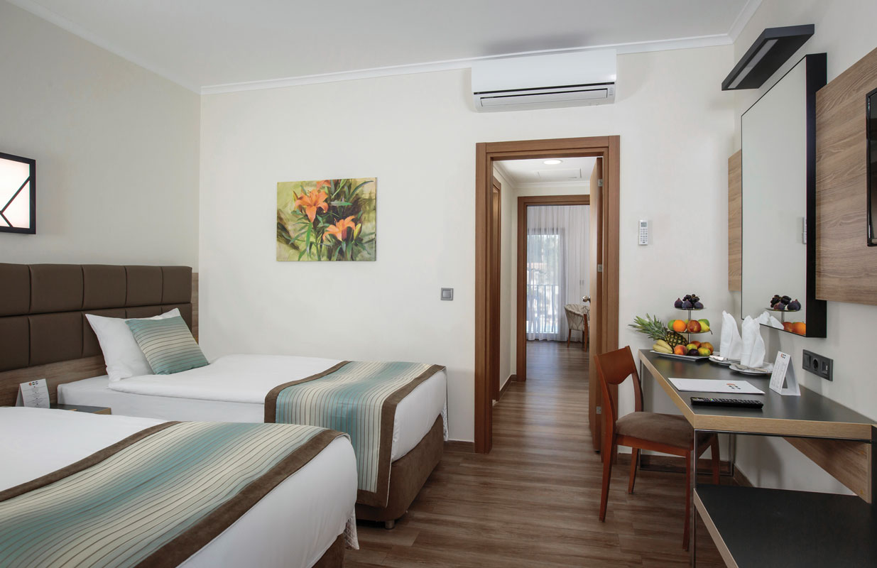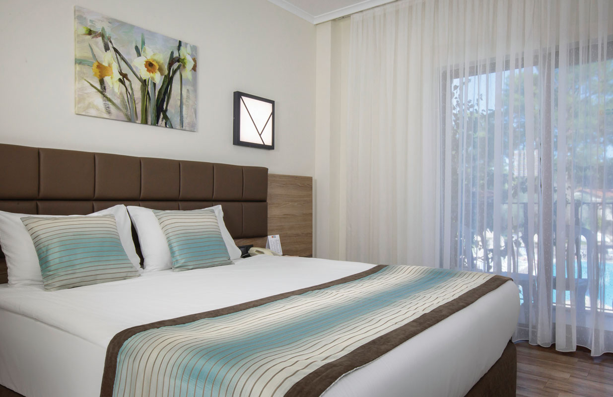 En fazla üç katlı binalarda yerleştirilmiş olan odalarımız havuz ve bahçe manzaralıdır. Oda girişleri, açık merdivenler ve açık koridorlar ile bağlantılıdır. Aile odalarımız, içerden geçmeli iki ayrı odadan oluşmaktadır.