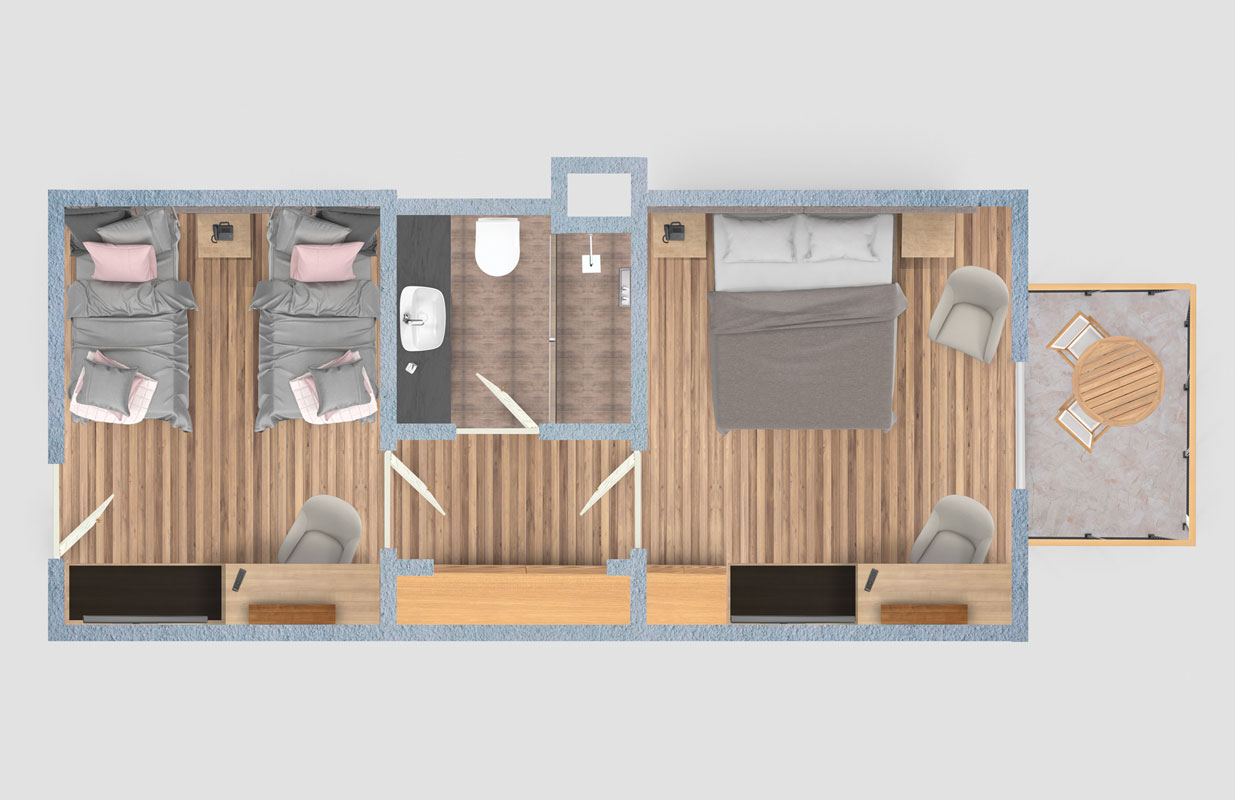 Oda Tipi4 Yetişkin + 1 bebek veya 2 Yetişkin + 3 çocuk konaklama kapasitesi.